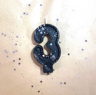 Свеча для торта восковая "Гламур", "Цифра 3" черная с серебром100 руб.Свечи изготовлены вручную из 100% пчелиного воска и добавления красителей.Высота свечи - 5,5см.